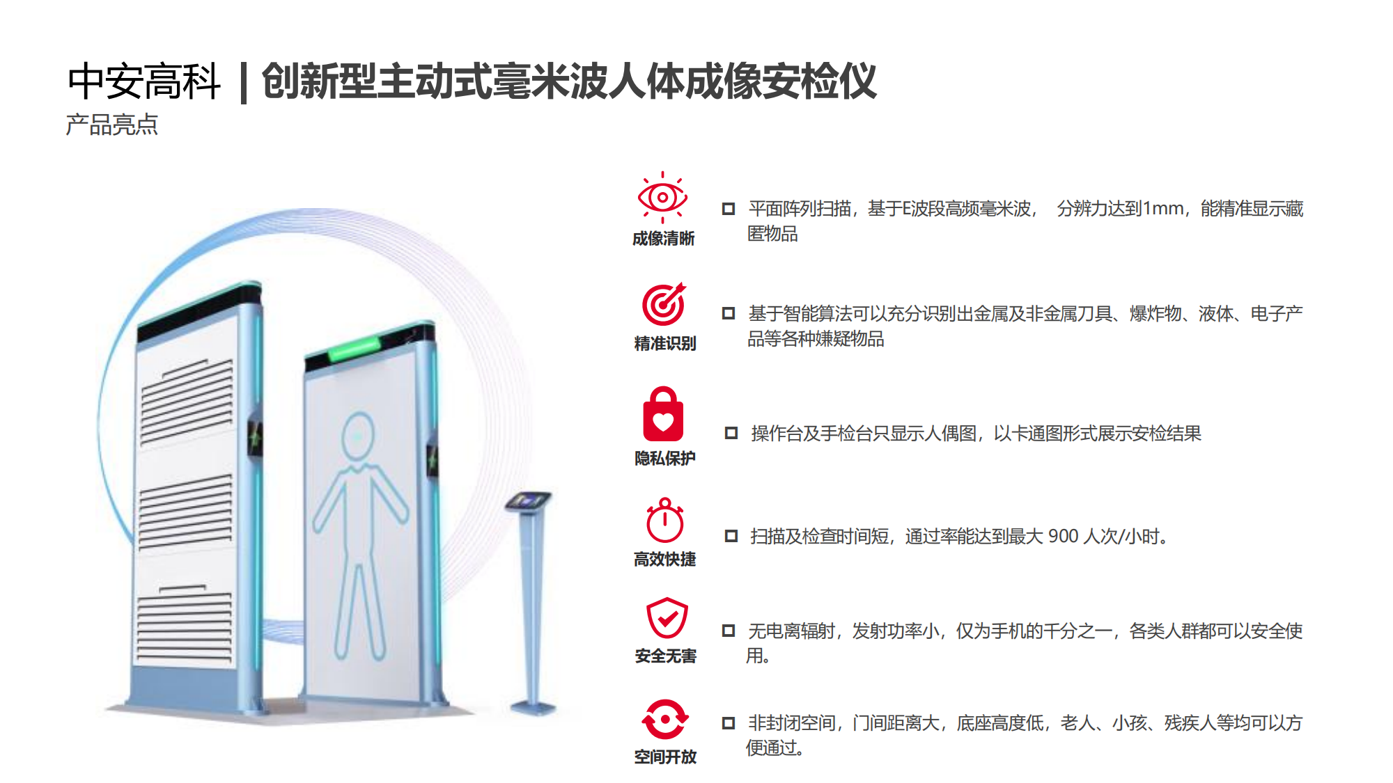 ○ 非接触式安检, 毫米波不穿透人体,无电离辐射,保证各类人群安全使用